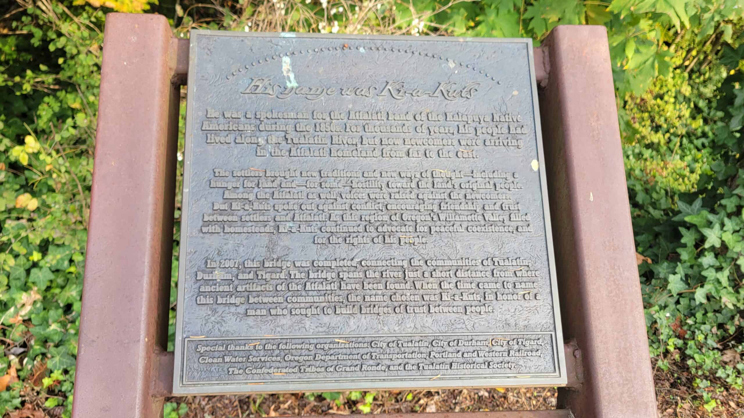 The Ki-a-Kuts pedestrian bridge takes the Tualatin River Greenway Trail over the Tualatin River. The bridge in named in honor Chief Ki-a-Kuts who led the local Atfalati tribe during the 1850s. Click here for more information.